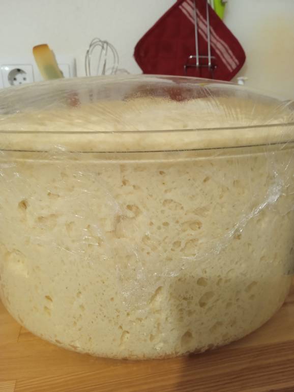 Потом поставила тесто без особой надежды, что оно поднимется, т.к. плотное получилось. Пока ездили с мужем по делам, оно заполнило собой огромную миску от аэрогриля.