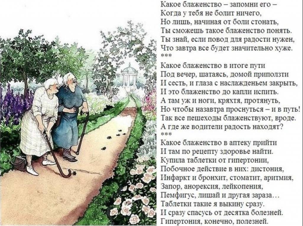 Василиса, прочитала стихи про счастливых людей (бабуль). Очень понравились. Очевидно, что написал человек, который глубоко "в теме". Такие люди есть в реальности - у меня есть такая реально счастливая знакомая, инвалид, 70 лет, еле ходит, одна, без телевизора, интернета, слушает сутками радио-Радонеж и счастлива.