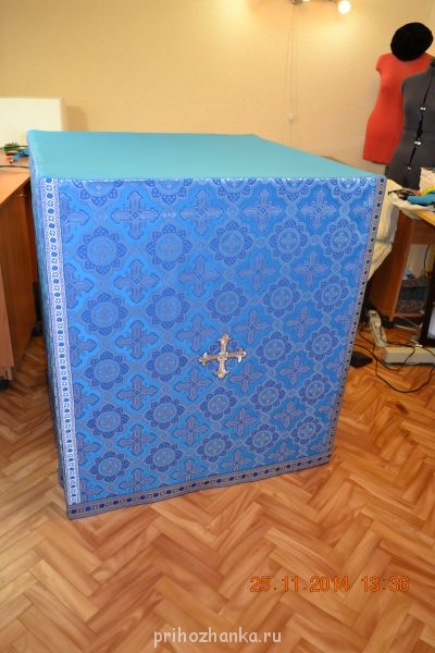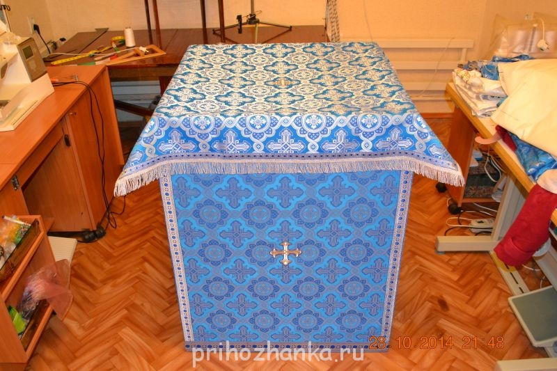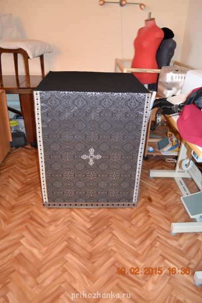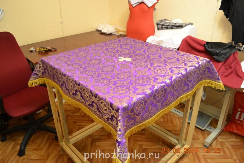 Девочки, добрый вечер. Простите, из-за проблем с выходом в интернет, не могу пока в полной мере влиться в общение на форуме. Вот уловила рабочий моментик модема, и покажу мои первые работы. Не знаю, сюда ли я вставляю фотки. Шью для сельского прихода. Батюшка соорудил мне копии престола и жертвенника, чтобы можно было бы примерить изделие, до того как отдать в храм. Облачение на престол и жертвенник шились из церковного шелка. Для экономии ткани (по просьбе батюшки) верхнюю часть делала из бязи, из габардина и из плотной черной х/б. Застежка везде одна на пуговицах (с боку ). Фото только те что успела сфоткать.