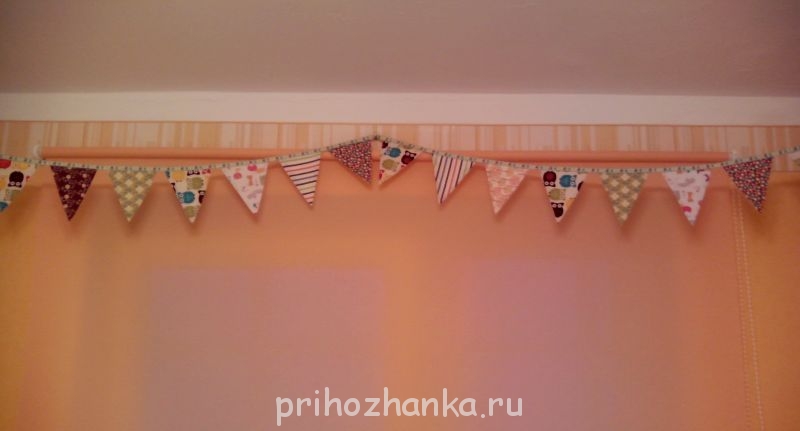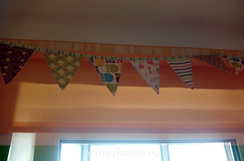 И сшила из остатков тканей гирлянду в спальню. Повесила ее над шторой. Получилось весело