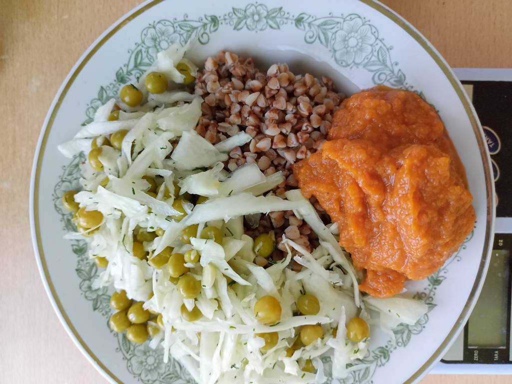 Мне свекровь картошки сварила, был салат из капусты и зеленого горошка.