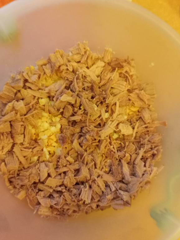 Младшему отбирала салат, добавила зелёный горошек и майонез, вышло типа оливье