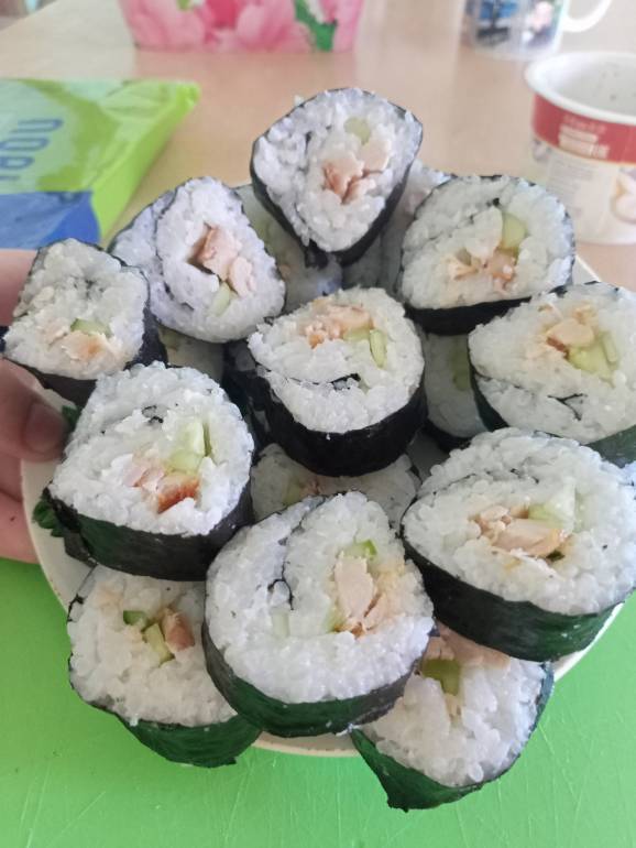 Первые делала из нори, риса и огурцов. Но я купила кунжут, имбирь, соевый соус. Дочери очень понравились. Для мужа добавила куриное мясо.