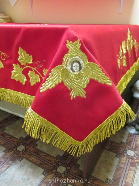 Портьерный софт, не самый лучший материал для машинной вышивки, но нам его пожертвовали целый тюк, смотрится он красиво, вот и шью все что можно из него.Жанна72: А на престол пелена из какой ткани пошита ?