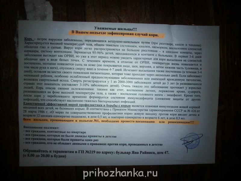 Синий Чулочек, это объявление висит на двери моего подъезда, где я живу и бываю каждый день, и на всех дверях, на всех этажах. На моем этаже из 6 квартир в 4-х живут дети, которые уже могли заразится, если не привиты. По факту болезни прививаться уже нет смысла, вирус уже в организме.