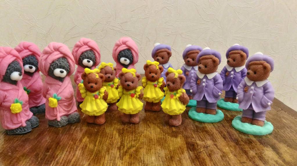 Розовые мишки пахнут малиной, сиреневые - ванилью, а желтые - отдушка США "Бермудский треугольник " ( дыня, мандарин, танжерин, грейпфрут, лайм, яблоко Макинтош).