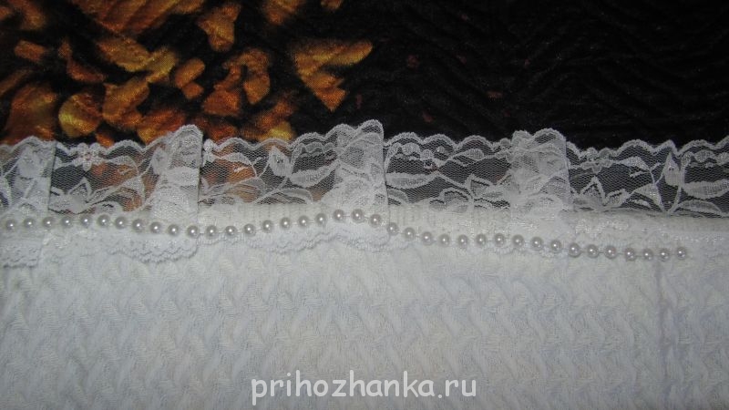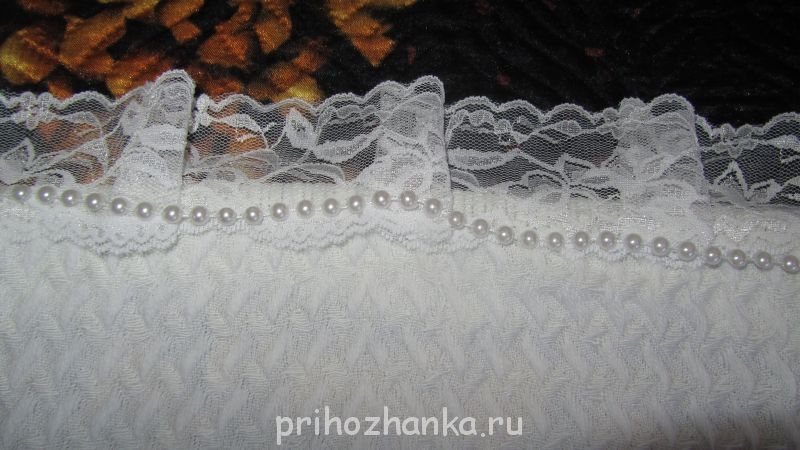 Простынку обметала плотной строчкой на оверлоке. Загнула на о,5см на лицев.сторону, приутюжила. Сверху наложила кружево. Заколола. Пристрачила.