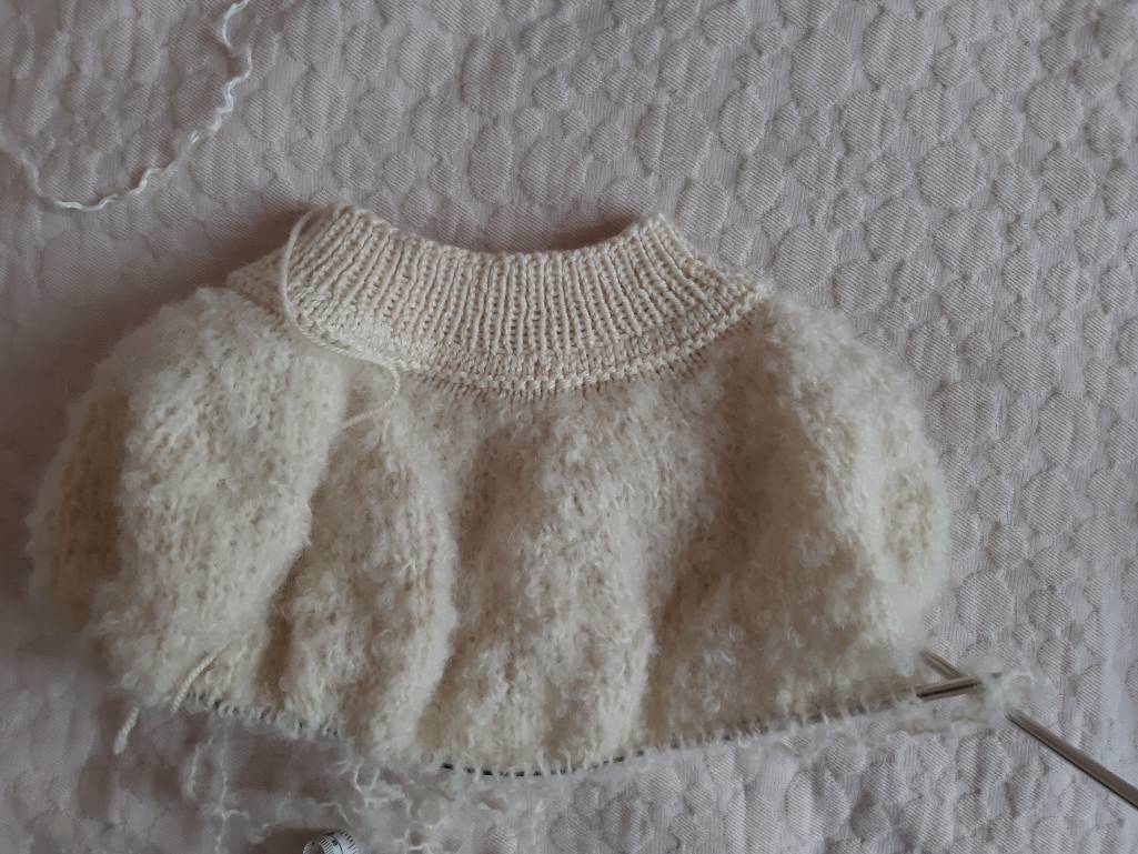 Дочкин пуловер , как уже писала, я распустила и начала по новой- горловина с применением имитации кеттлевки плюс еще около 14 см кокетки