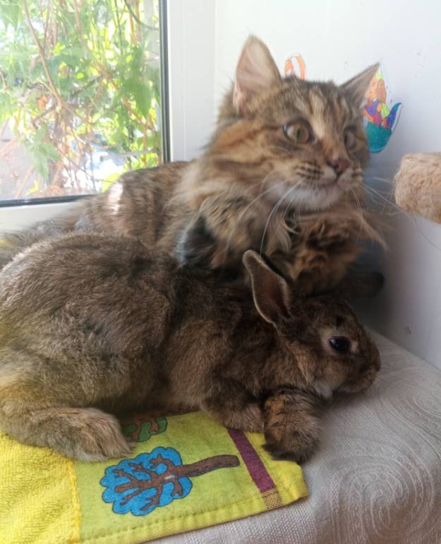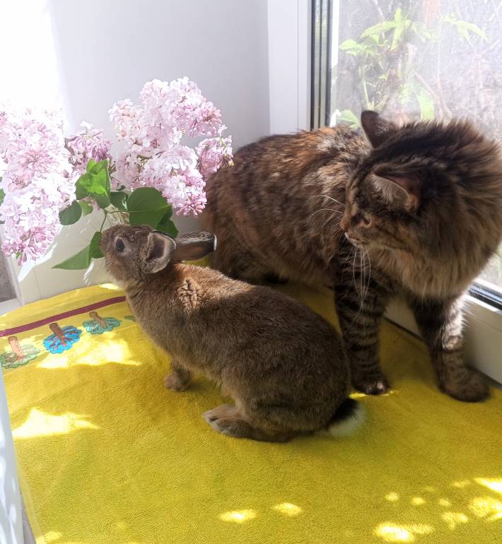 Сначала казалось что Шанелька, кошка, обижает кролю. Но понаблюдав, успокоилась. Они в кошки мышки игруют , меняюсь ролями.Что стало неприятной для меня неожиданностью, что крольчиха запрыгивает на высокую кровать. Семки на погрызешь, прибегает на запах.