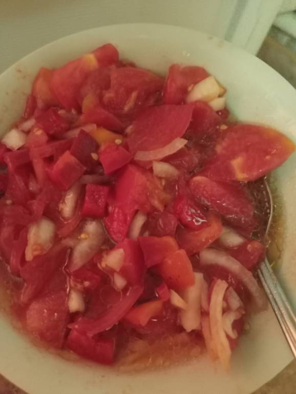 С утра варила булгур, делала салат из помидоров, перца с луком и маслом. Был суп. Свекровь принесла жареную рыбу и вареные яйца.