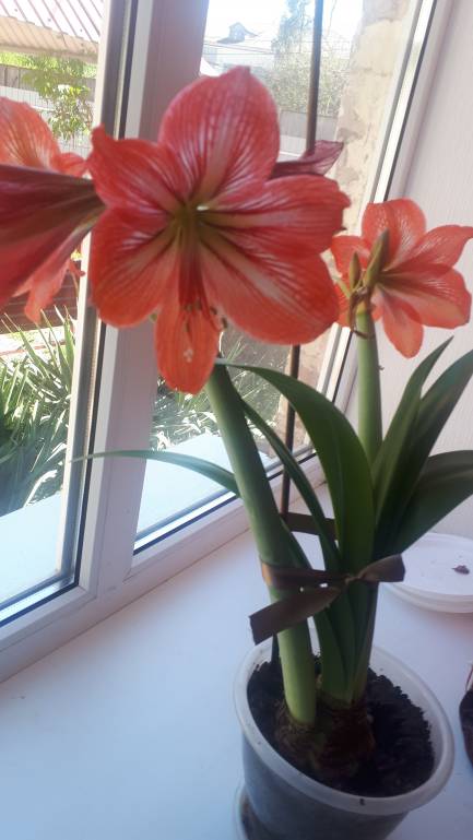 в марте делала материал с одной интересной дамой,она мне придарила луковицу амарилиса,вот какой вымахал