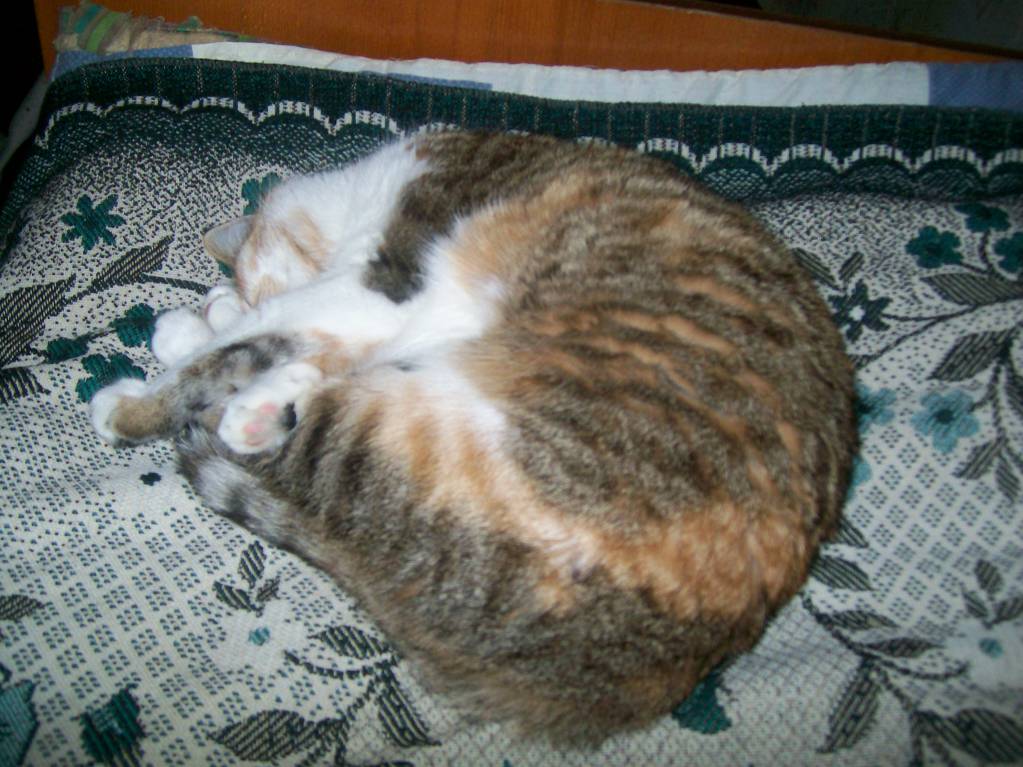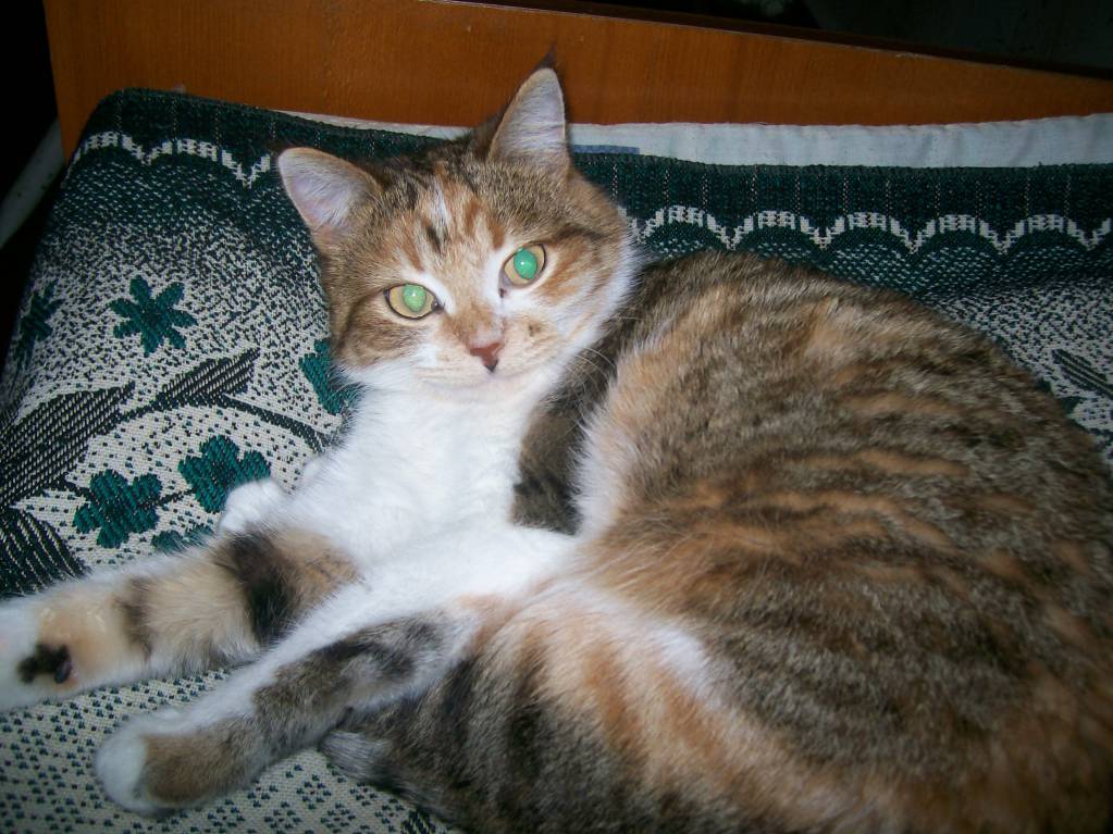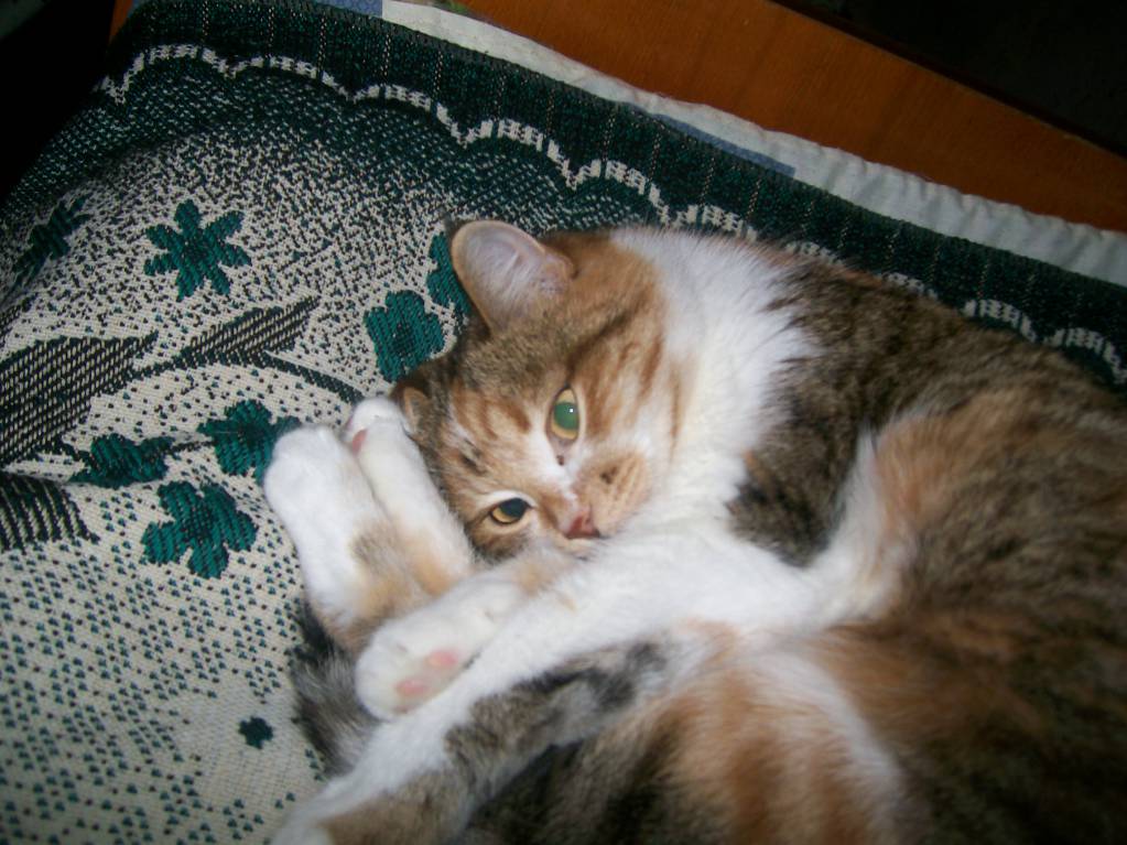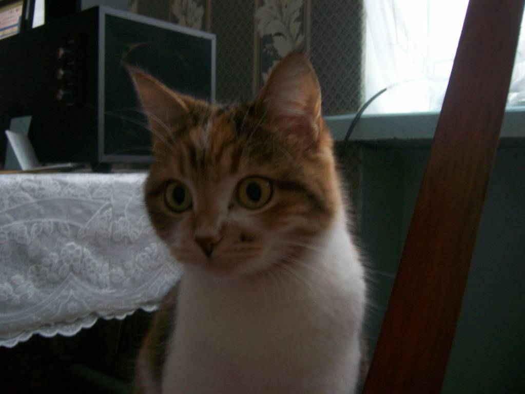 Говорю:"Жалко, замёрзнет, давайте возьмём." Народ против, у нас, мол, и так 3 кошки. Но я настояла всё-таки:" Говорят, раз кошка сама пришла, значит надо приютить." Оказалось, это не кот, а кошка, причём с бельмом на глазу, потому и казалась одноглазой в темноте. Расцветка-"черепаха". Диковатая была, суровая. Гладить себя позволяла зачастую только мне, другим - по настроению, если что не так- кусалась, чувствительно так. Летом на вольные хлеба ходила- разок придёт, поест, полежит, типа проверила, всё ли так, как надо, и опять уходит на неделю куда-то. Котят родила, мы их раздали, кроме одной кошечки такой же расцветки, а саму стерилизовали. Своим котятам чего только не ловила: мышей, ящериц, птиц(жалко их, конечно, но...), а вот дочка её на этот счёт - редкостная тупица- "природа на детях отдыхает"
