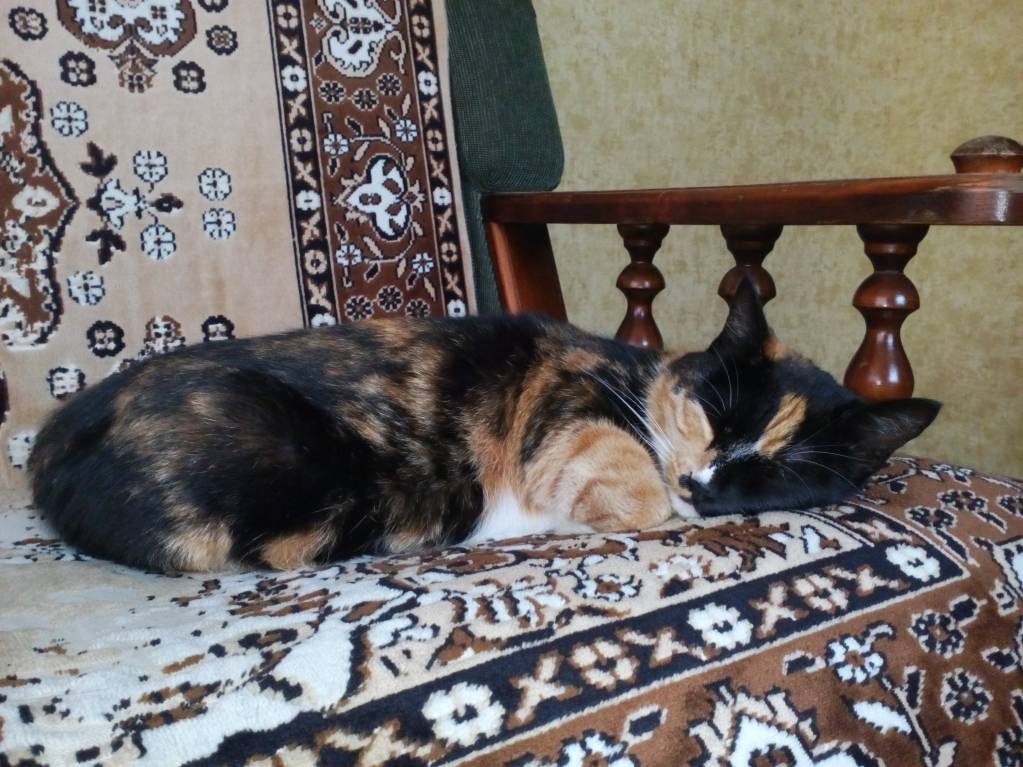то морду в лапы запрячет, то передними лапами себя обнимет, или вообще мордой уткнётся в диван и спит.