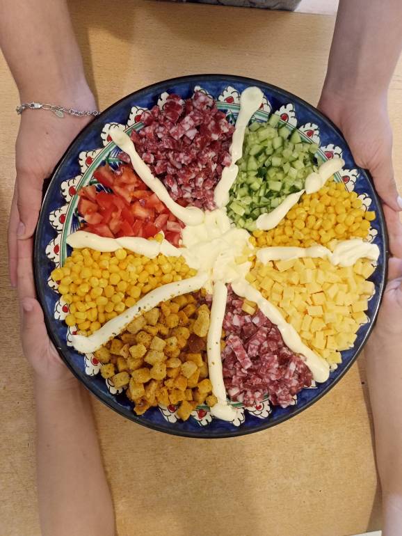 Мышенька, у меня в молодости подруга любила такой делать. Ну как такой, принцип тот же: на блюдо выкладывались ингредиенты кучками, потом уже на столе перемешивали. Назывался "французский". Довольно заморочный был, но очень вкусный.