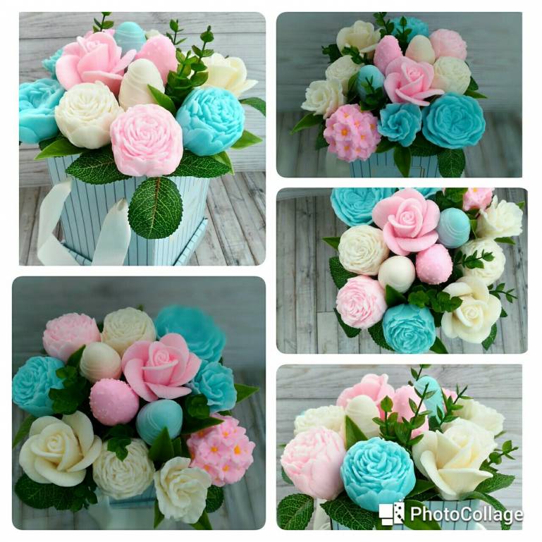 Пиона, у мыла с нуля Отдушки "ягодный сок" и " душистый горошек", у беретов какой-то мужской парфюмированный, их делала к 23 февраля. У букета аромат "Цитрус и гранат", отдушек много разных, добавляю в зависимости от настроения