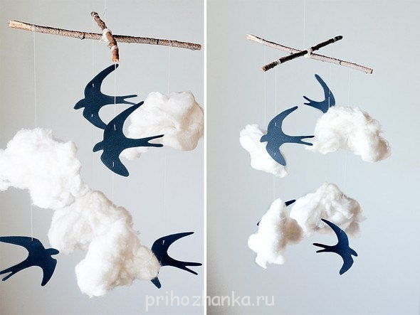 Можно, конечно, было набить синтепоновыми шариками (как, например, птичек для мобиля), но я не стала. Мне и так нравится. к тому же, к ребенку всегда будет повернута одна из сторон, боком ему не придется на гирлянду смотреть, поэтому толщина не нужна.