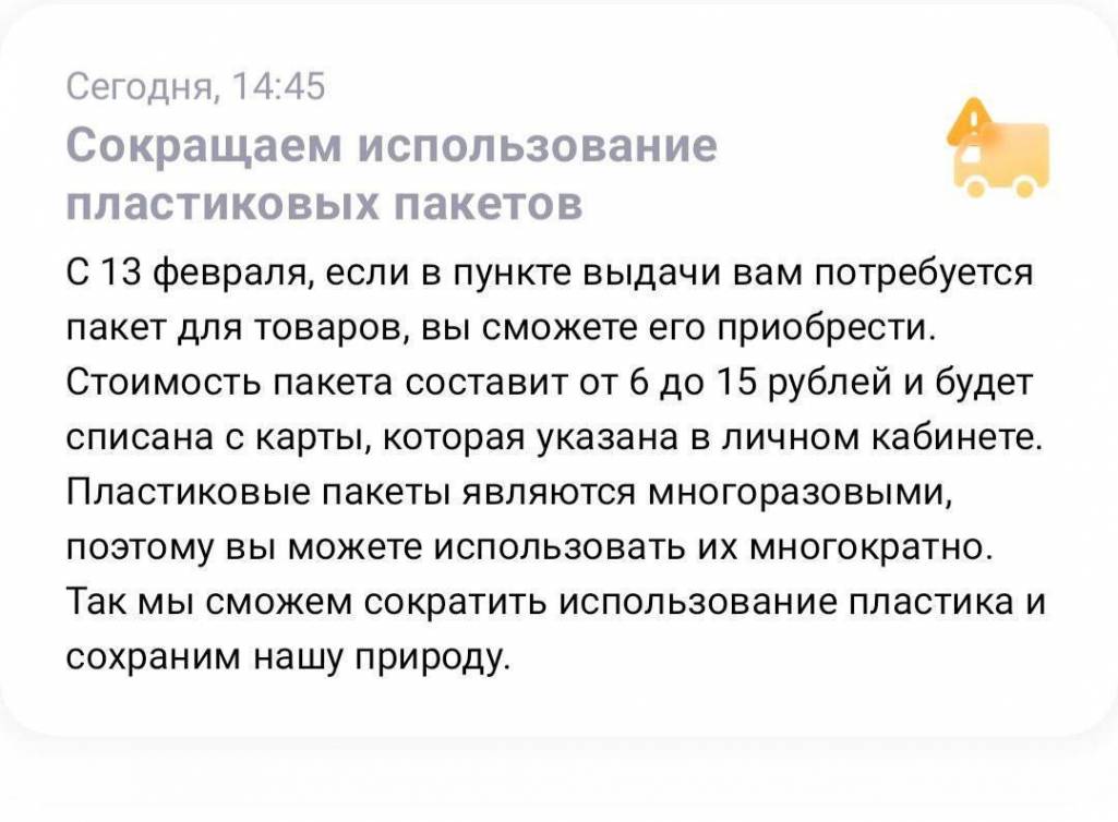 Ничего себе! Часто заказывала на озоне, видимо, у нас прогресс до того ещё не дошел. Пакетов бесплатных нет с лета. Одно дело продавать пакет в случае необходимости на пункте самовывоза, если кто-то забудет и некуда будет положить товар. Другое дело - автоматически навязывать пакеты для заказа и брать за них плату. Надеюсь, ВБ до такого не дойдет.Марьюшка: 11 фев 2023, 13:20 На озоне давно платные по 5 р, при оформлении предлагают добавить в заказ. На онлайнтрейде тоже, на месте можно купить.
