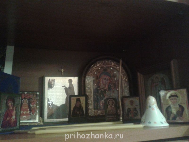 У меня тоже иконы во всех комнатах. В кухне - иконы Богородицы 'Спорительница хлебов' и 'Семистрельная'. У детей в спальне именные иконы. А в спальне нашей с мужем и на стене, и полку книжную я под них отвела, и на книжной полке еще стоят, на которой православную литературу я храню. У мужа в мастерской тоже одна иконочка маленькая - он сам попросил. Муж все обещается мне полочку-иконницу сделать, но когда это будет, не знаю.