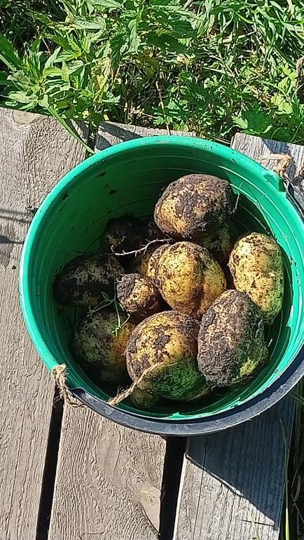 Картошку в этом году не садила, но выросло штуки три кустика с прошлого года. Сегодня приехала - там ботва полегла. А вообще на этой грядке у меня тыква. Вот пришлось картошку аккуратно выкопать. Тыква теперь зато стоит чистенькая, несколько штук растут.