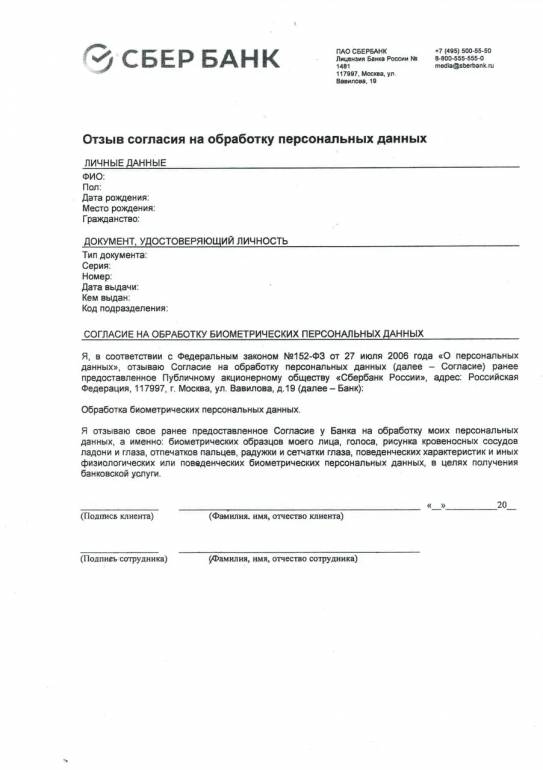 И есть бланк , как я, поняла для Сбербанка " Отзыв согласия на обработку персональный данных" ( это тоже по поводу биометрии).