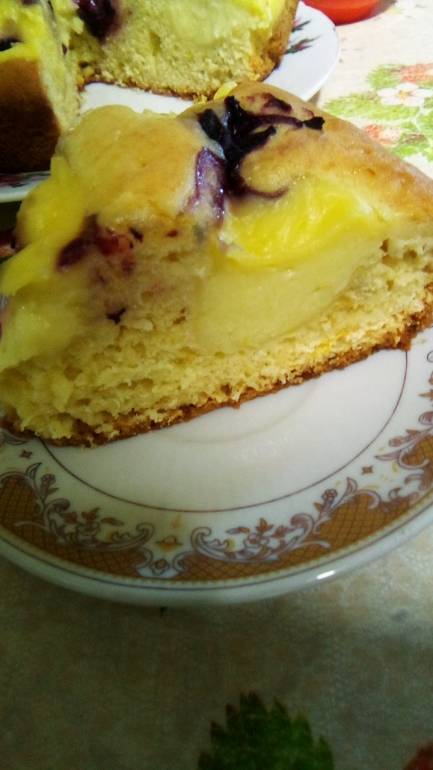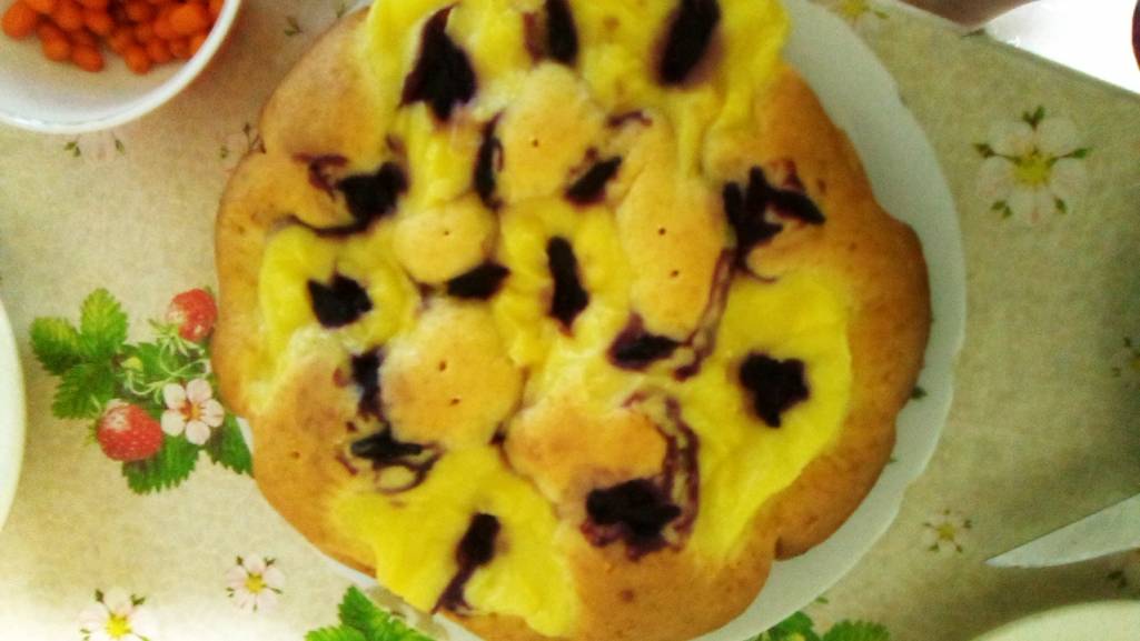 пирог с ягодами любыми, немного. Горсть. Кто то яблоки кладет. Я положила жимолость из морозилки. И с заварным кремом.