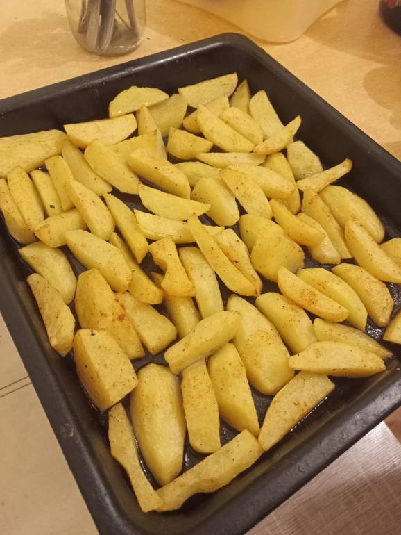Почистили, порезали вдоль на 4 части. Приготовила смесь из любимых приправ, воды и растительного масла. Всё "окунула" в смесь и выложила на противень. Дочь ещё бумагу подкладывает, а у меня закончилась