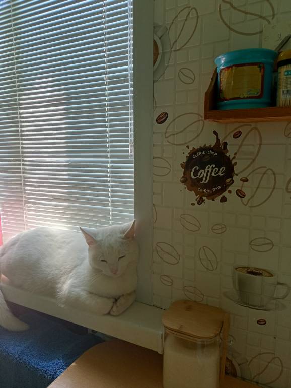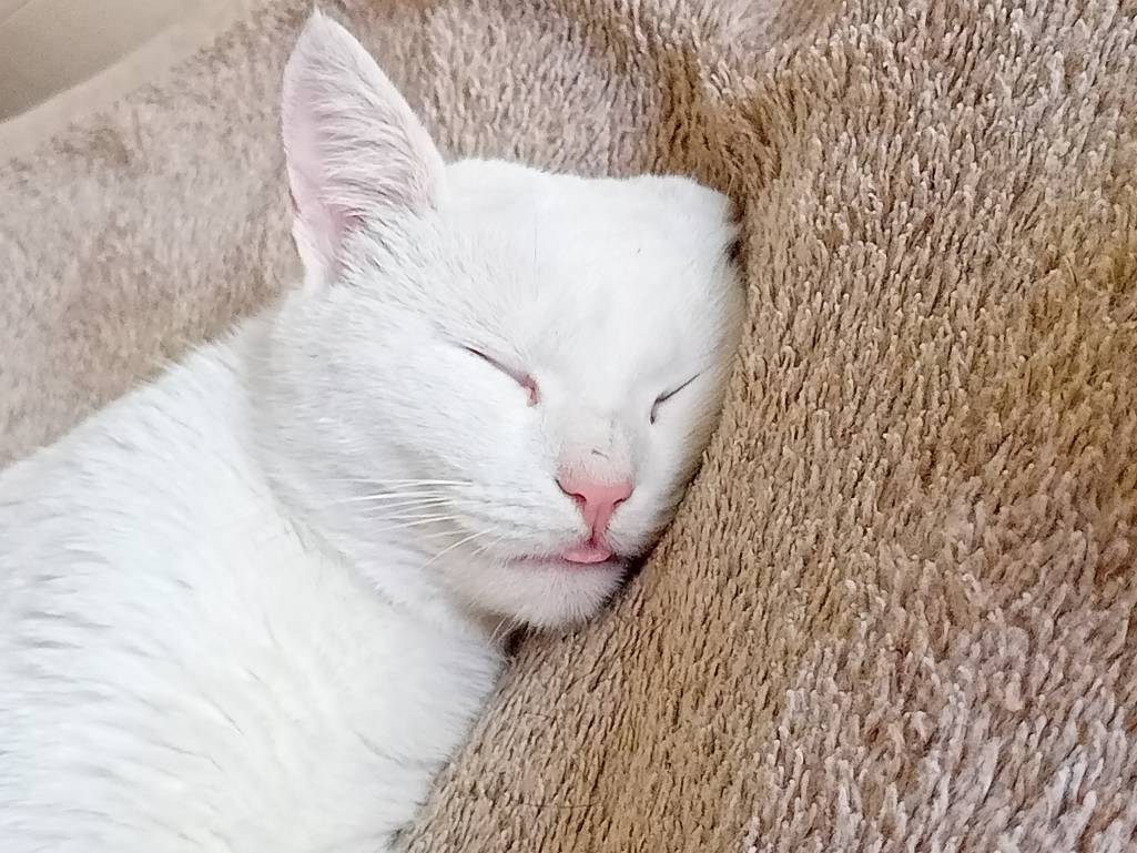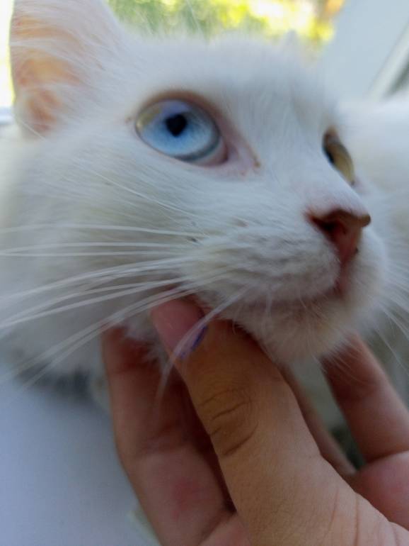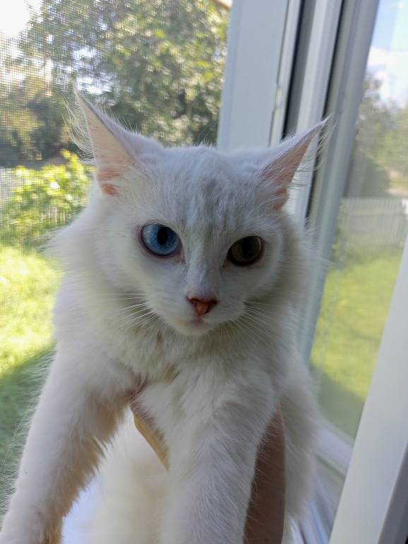 Белая, глухая, шерстяная, разноглазая, но очень ласковая кошка