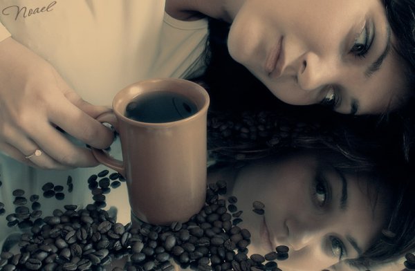 Силуэт девушки пьющей кофе на фоне вечернего Парижа..