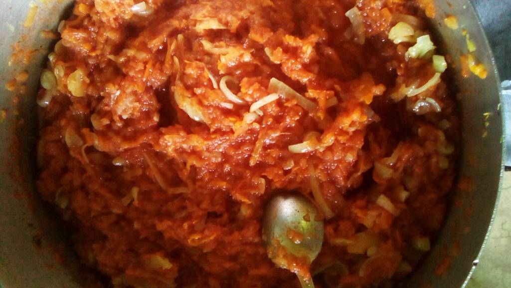 У меня на 3 кг. кабачков, моркови средних 10 шт. (Это приблизительно 800 г. Плюс минус большой роли не играет), лук средних 8 шт.( 600-800 г ). Кабачки можно порезать кубиками, мне показалось, что лучше в тёрку. Наливаю в кастрюлю масла так, чтобы это можно было обжарить. Но я не жарю. Просто немного масла дно прикрыть и тушу прямо в кастрюле под крышкой.отдельно по очереди в сковороде тоже на масле обжариваю лук порезанный и тёртую морковь следом. Потом отправляю их к кабачкам в кастрюлю. То есть смешиваю все овощи уже стушенные до мягкости. Добавляю 300 г. Томатной пасты. Я всегда беру "Помидорку", кстати большая банка на 700 г. по цене самая выгодная, 1,5 ст.л. соли, 2 ст.л. сахара. Соль без горки, а сахар можно сделать немного с горочкой. Масло больше не добавляю. Только то, что для обжарки пошло. Уксус 9% всего 1 ст.л. Он там практически и не чувствуется. Тушу это все вместе минут 20,потом разбиваю блендером. Кстати, до блендера масса имеет красноватый цвет. Но после разбивки икра приобретет привычный оранжевый цвет. Снова ставлю на огонь, добавляю специи. По рецепту черный молотый перец по вкусу. Я его не кладу. Кладу кориандр молотый. 2 ст.л. , но самое вкусное по моему с хмели сунели. Увариваю икру ещё минут 40. После этого раскладываю по стерильным поллитроввм баночкам. Выход в зависимости от уваривания. У меня обычно чуть больше 3,5 литров или 4 литра. По рецепту не указано нужно ли стерилизовать банки с икрой. Но учитывая мой неудачный опыт с кабачковой икрой, я перестраховываюсь. И по этой причине банки накладываю не до краев. Стерилизую поллитроввм баночки минут 15-20 с момента закипания. Потом закатываю, переворачиваю и укутываю до следующего дня.
