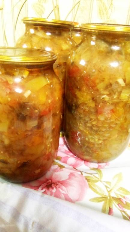 Салат из баклажанов. Вчера закатали. Баклажаны,перец,лук,помидоры, без уксуса. Если нужен рецепт,напишу.