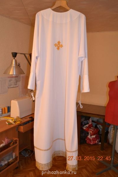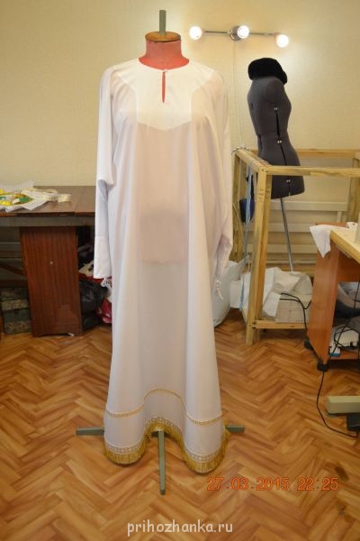 Дочка принесла домой фотик, и скину еще немножко фоток с него. Шила первый раз подризник. Ткань мокрый шелк. Рукав цельнокроеный, плечевого шва нет. В боковых швах прорези. Швы все закрытые, обработаны без оверлока. Выкройку снимала с готового покупного, поэтому всю обработку сфотографировала, и так же все и обработала. Крестик вышивала сама. Но не пойму - что то его в кось повело, хотя четко намечала линии пришива.