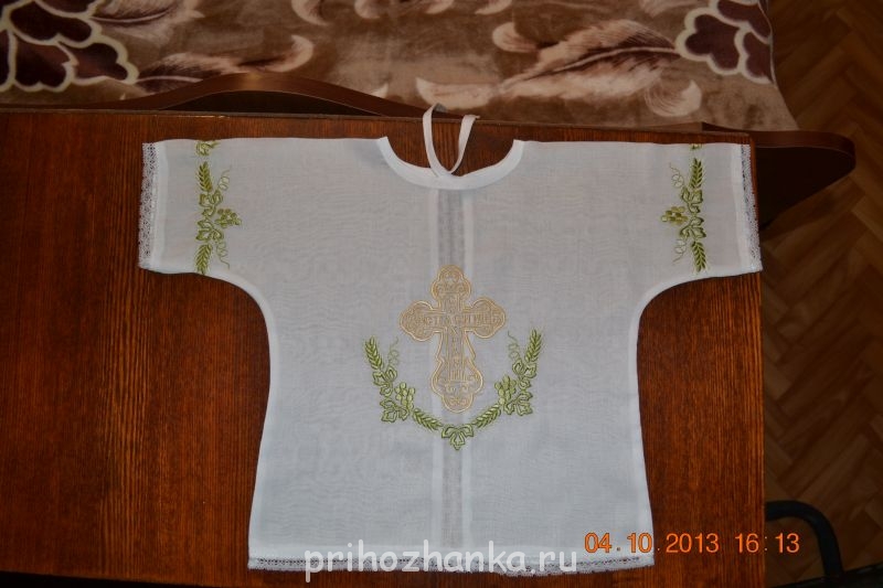 Еще нашла - давнишнее фото. А все еще лежат не скинутые на жесткий диск. Распашонка крестильная. Шила для нашей прихожанки, и уехала она в подарок тогда еще неродившемуся ребеночку на Украину, в Харьков. Зять у нее священник ( не знаю правильно ли я написала).