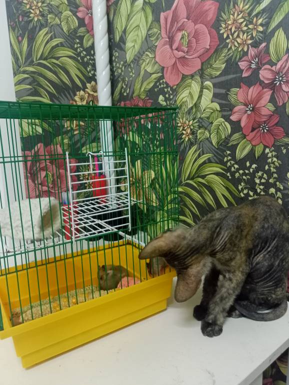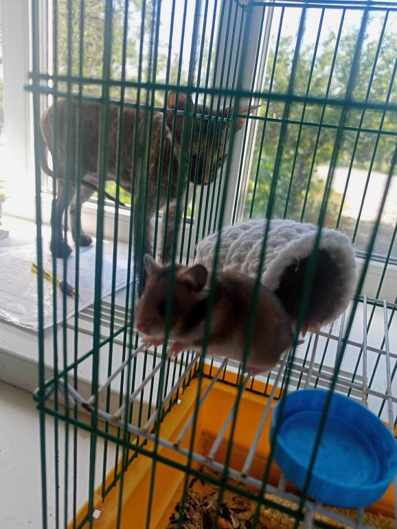 Хомяки в отдельной комнате, на приличной высоте. Кошкам показали, но разве это кошки