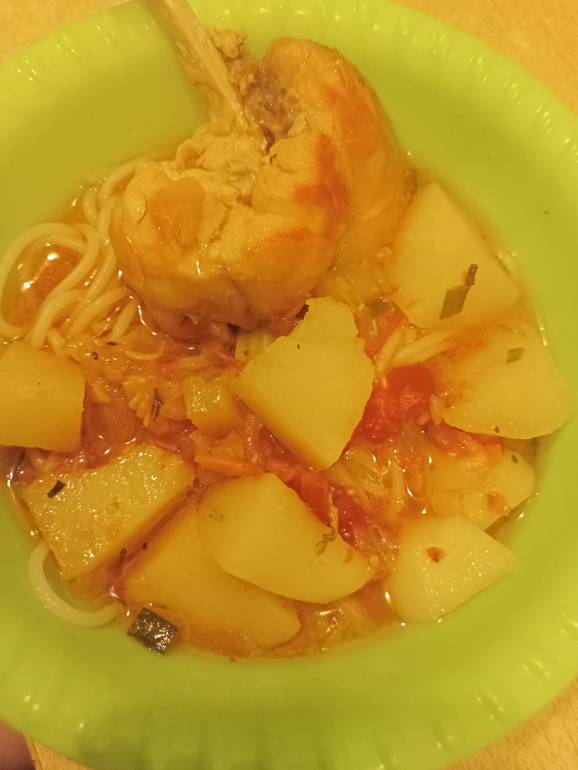 Хлеба мало, идти лень, поэтому замесила и пожарила лепешки с луком. Ну, и были остатки куриного бульона. Хотела сварить щи, но на капусту места не хватило, только картошка вошла.