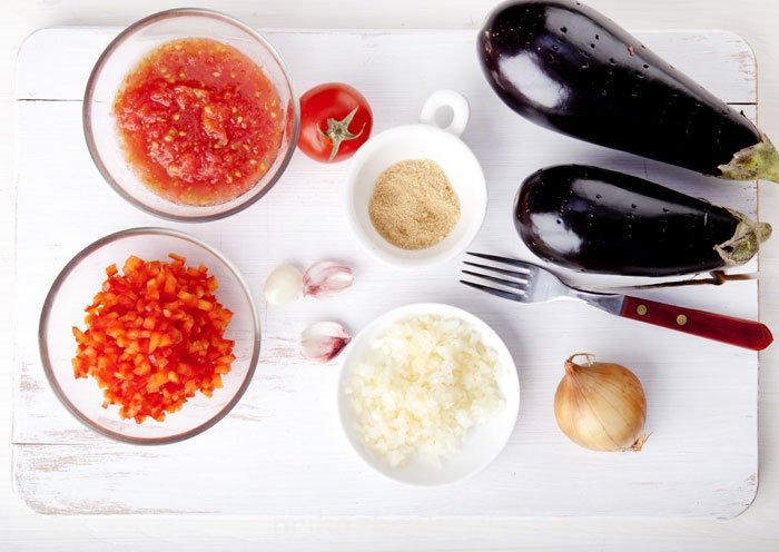 Способ приготовления Духовку предварительно разогреть до 250°С. Баклажаны часто наколоть вилкой, выложить в небольшой противень и отправить в разогретую духовку на 10–12 минут. Помидор разрезать пополам и натереть на крупной терке так, чтобы кожура осталась в руках. Лук и чеснок почистить и мелко порубить. Перец вымыть и, удалив перепонки и семена, мелко порезать. Разогреть в сковороде оливковое масло и обжарить лук и чеснок до легкого золотистого цвета. Добавить нарезанный перец, затем натертый помидор, всыпать сахар, перемешать и готовить соус на медленном огне. Оливки раздавить плоской стороной ножа, вынуть косточки и добавить в сковороду с овощами, посолить, поперчить и перемешать. Удалить кожуру с печеных баклажанов, стараясь сохранить плодоножку. Придерживая за хвостик, нарезать мякоть баклажана полосками вдоль, чтобы получился раскрытый веер, посолить, поперчить. Кинзу мелко порубить. На баклажаны выложить ароматный соус и посыпать кинзой.