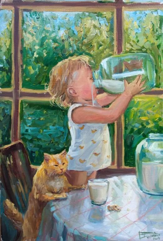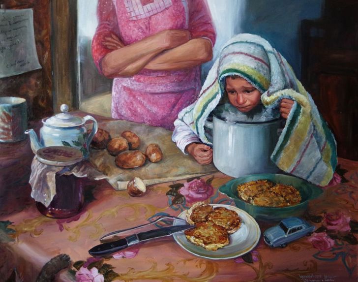 , и над кастрюлей вот так с полотенцем над паром сидела, когда болела. Мне понравилось, что художница это все подметила. Тогда трудности ощущались, но, что грустные эти дети, согласиться не могу. Но, может, до Серебряковой этой художнице еще далеко в плане художественного образа, в целом