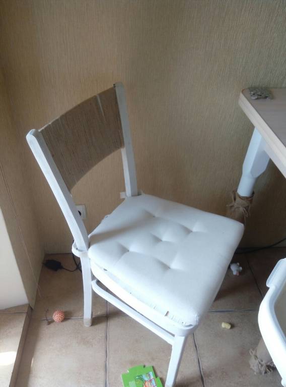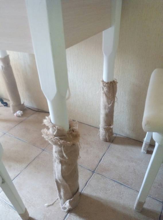 Мы с мужем сами реставрировали и декорировали кухонный стол и стулья. Спинку обматали бичевкой, на ножки одели мешковину и завязали бичевкой. Очень оригинально получилось. Стол и стулья выкрасили в белый цвет