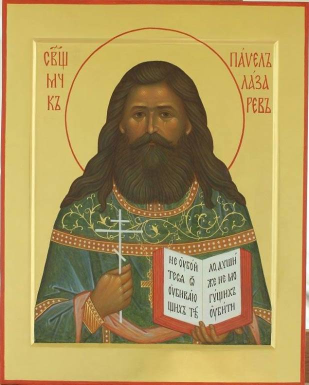 Священник Павел Андреевич Лазарев родился в городе Колывани на реке Обь в 1877 году в семье мещанина. Обучался в Томской губернской ветеринарно-фельдшерской школе, затем три года проходил службу фельдшером в Сибирском резервном артиллерийском дивизионе. В 1904 году он состоял регентом Никольской церкви в Никольск-Уссурийском. В 1908 году женился, впоследствии в его семье родилось четверо детей.