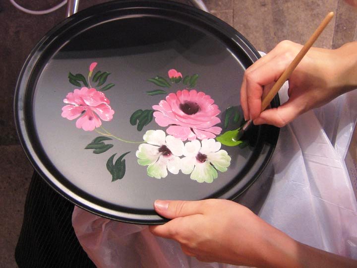 В Жостове чуть ли не в каждом доме рисуют, гнут и продают подносы. В первом же подворье хозяин не только показал десятка два образцов разной тематической насыщенности и калибра, но и в деталях объяснил и даже продемонстрировал процесс производства.