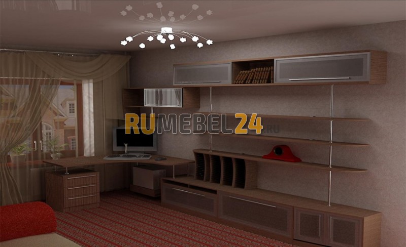компьютерный стол будет, скорее всего по той же стене, что и стенка, в том же цвете и с такими же полками как в стенке. Сразу у окна стол, потом стенка и все, напротив диван.