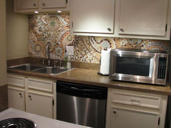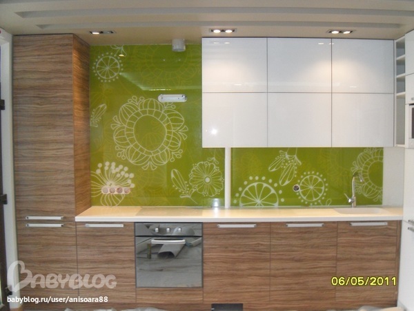 Смотри, какие красивые фартуки. Вы же стекло будете заказывать? Можно ведь любой рисунок сделать. Мозаика, например: