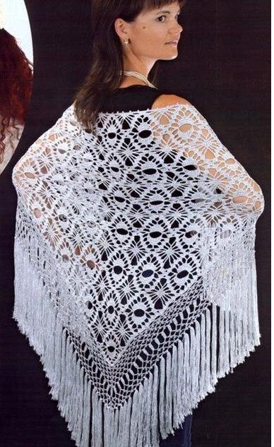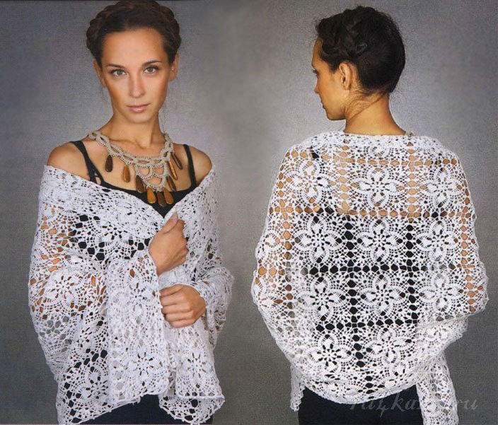 Ажурный палантин, вязаный крючком из нежных и воздушных квадратных мотивов. Такой палантин похож на воздушное кружевное облако, которое нежно окутывает и придает женственности.
