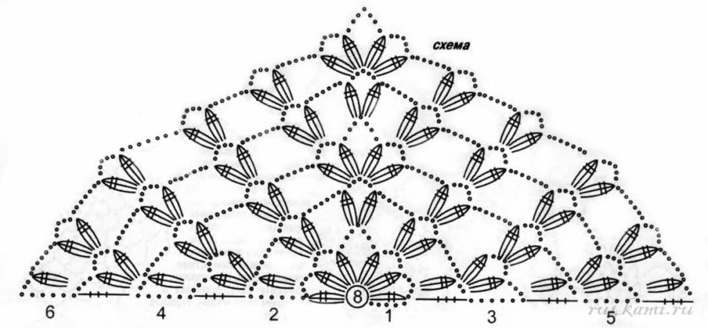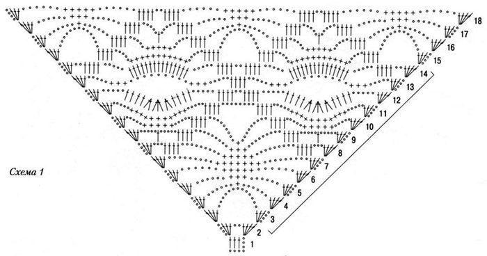 Шаль вяжем по схеме данной ниже, по трем направлениям постепенно расширяя вязание.