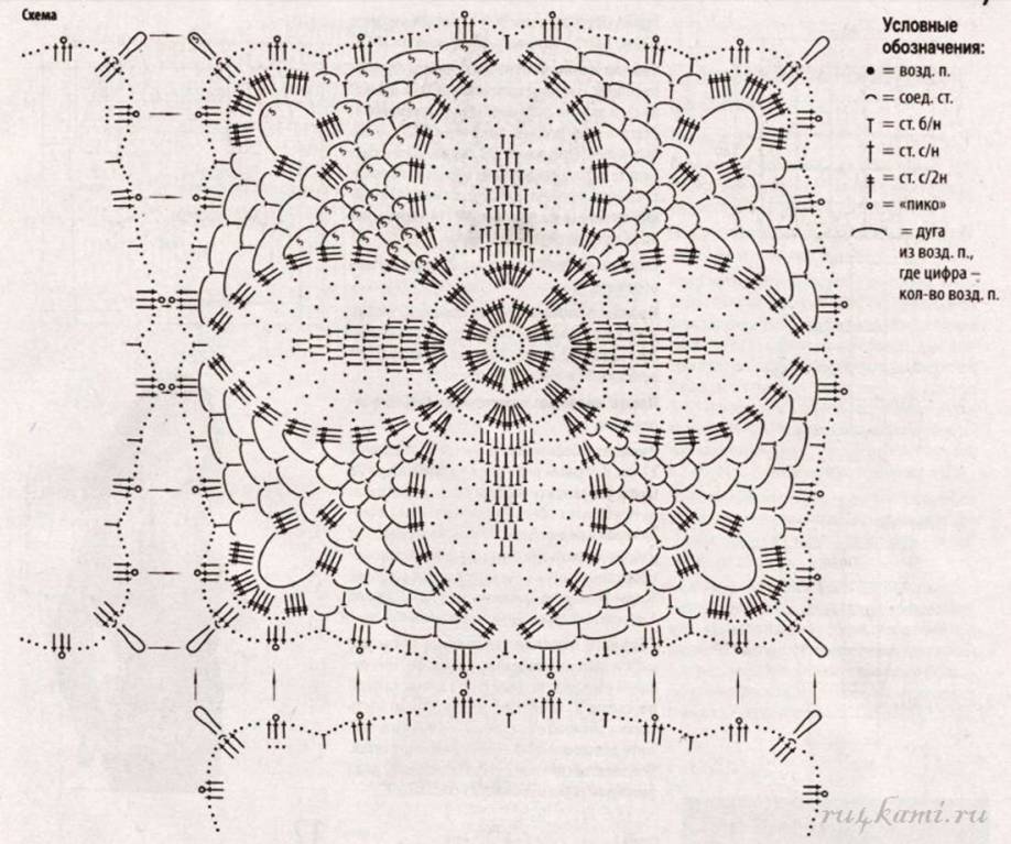 вертикальная штриховка - лиц. петля,горизонтальная - изнаночная петля. Дуга - накид. Треугольник - 2 петли вместе лицевой. Зигзаг - 6 петель оставить на вспомогательной спице за работой,6 лицевых,затем провязать 6 петель лицевыми со вспомогательной спицы.