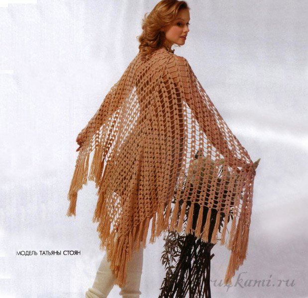 Очаровательная вязаная шаль крючком кремового цвета. Эта интересная шаль похожа на крылья птицы в полете, изящная и воздушная. Для вязания такой шали берем 500г. полушерстяной пряжи кремового цвета и крючок №2,5.