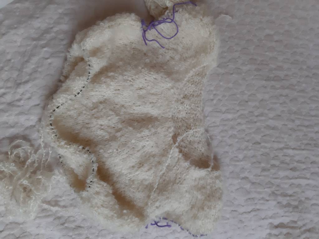 Палантин продвинулся "аж" на 19см(120петель один ряд- 57см в ширину), кокетку для свитера думала на раз два сделаю- а буклированная нить оказалась оч.неудобной в вязании(букле вязала сто лет назад уж и не помню как оно) потомуне могла с нормальной скоростью вязать. Получилось еще и не совсем по размеру, довольно широко, поняла, что буду комбинировать с другой пряжей, которой довяжу вверх потом горловину. Так будет и удобней, ибо букле не особо эластично- горловину в размер что б тянулась не выйдет сделать. И распускать сложно эту пряжу.