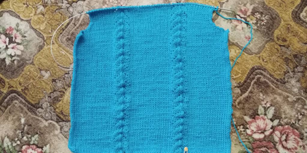 1. Кофта моя. Довязана спинка. 50 ряд. Начала полочки, две одновременно, связано по 36 рядов каждая. Итого: 122 ряда за неделю.