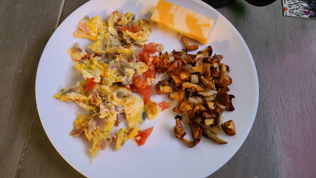 На завтрак омлет, свежо приготовленные лисички и голубика вчера собранная. Вкууууусно!