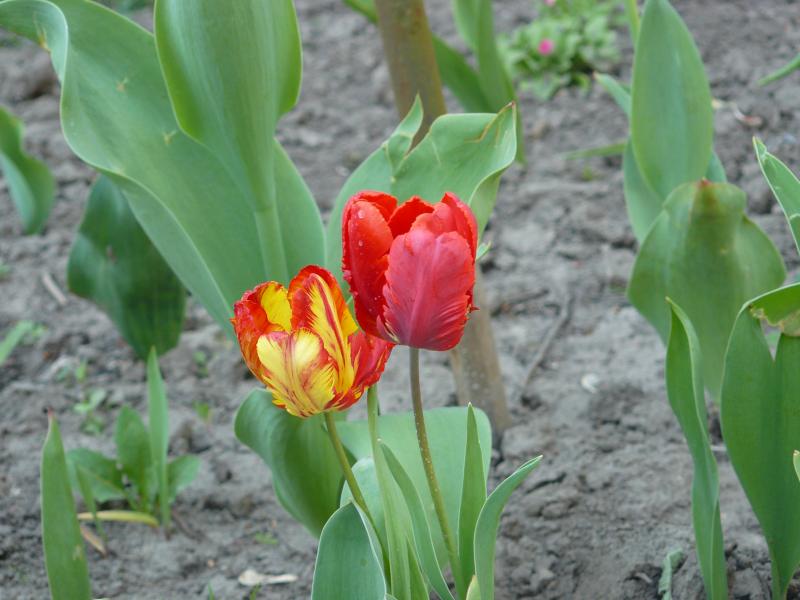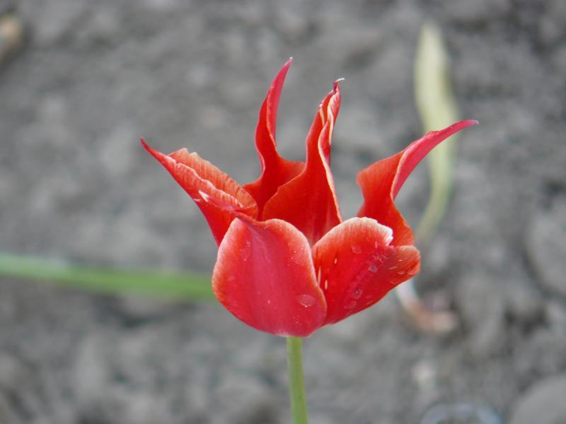 Это обычный ранний красный тюльпан. Ратсут они все на одной клумбе вместе с сортовыми, перезапылились друг от друга. Таких похожих несколько было - на половину с жёлтым. Жалко только, что красивые фиолетовые и белые тоже за два года переродились в полосатиков