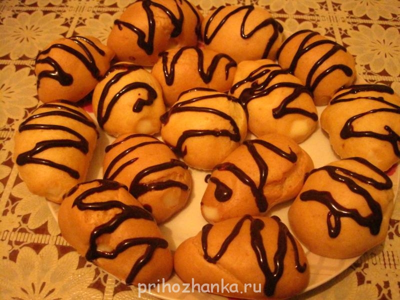 Кстати, крем внутрь я заправляла с помошью обычного полиэтиленового пакета, прорезав в его углу маленькую дырочку, и шоколадной глазурью украшала таким же способом